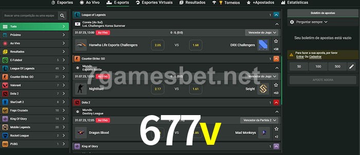 O 677v oferece uma grande seleção de opções de apostas em e-sports com probabilidades competitivas